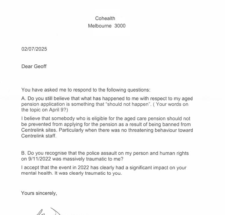 Geoff Fox, (denied access to the aged pension by bullies at “Services Australia”) September 3, 2025, Melbourne, Australia